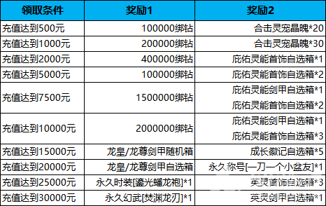 活动内容:活动期间内,限时累计充值达到指定档位,可领取对应档位奖励。