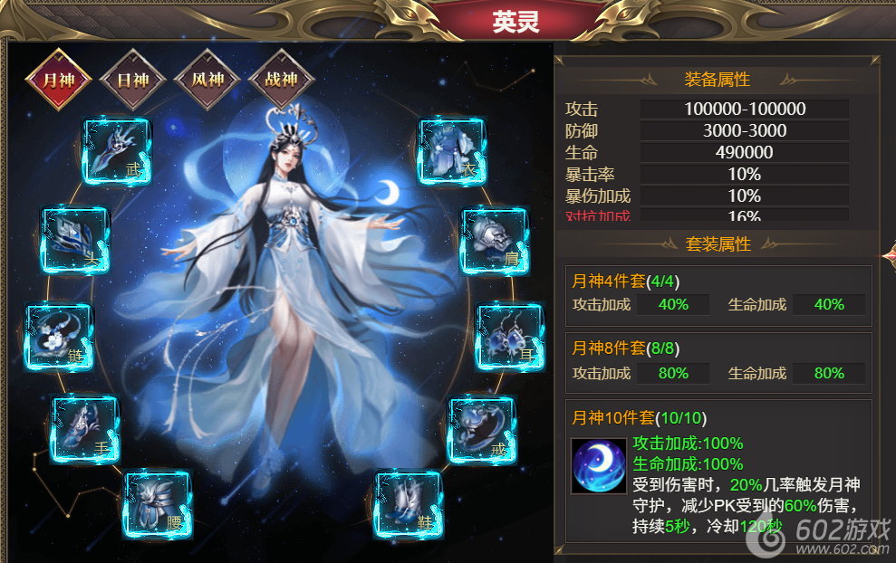 ②英灵装备可在月神、日神、风神、战神四套任意选择